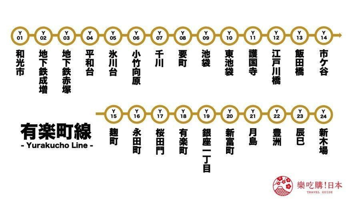 东西线横跨了东京都与千叶县,有乐町线则是连接起埼玉县与东京都的交通网。有乐町线共行经24座车站,以位於埼玉县的和光市站为起站、东京都江东区的新木场站为终点站,路线总长为28.3公里。有乐町线沿线有许多重要的政府机关,如皇居、国会议事堂、警察厅等,也行经银座、有乐町等逛街热点,路线记号为「Y」,代表色为金色。