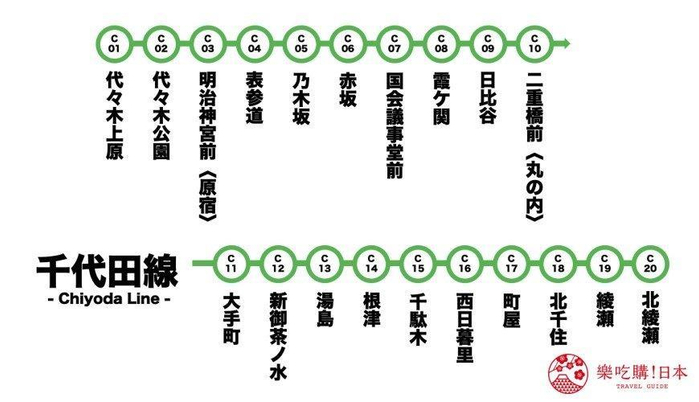 千代田线于1969年通车,总长24公里,行经20座车站,在东京Metro系统中,仅次於东西线与丸之内线,载客量第3高的重要路线。千代田线的路线记号为「C」,代表色选择绿色,路线所经之处的绿地很多,如位於汤岛站附近的旧岩崎邸庭园、日比谷站的日比谷公园、代々木公园站的代代木公园,因此选绿色当代表,可说是实至名归呢。除此之外,非常受游客喜爱的谷根千地区也在这里!