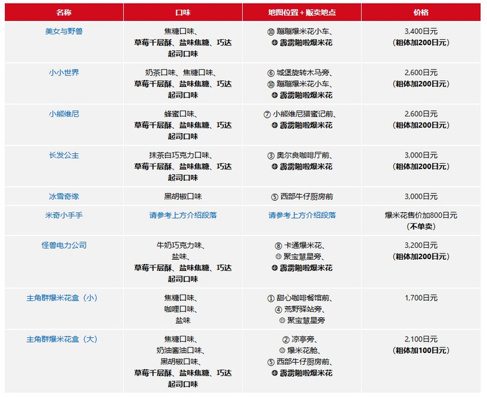 美女与野兽爆米花桶贩售地点 & 口味⑩ 蹦蹦爆米花小车:焦糖口味⑬ 霹雳啪啦爆米花:草莓千层酥、盐味焦糖、巧达起司口味(BB 爆米花)