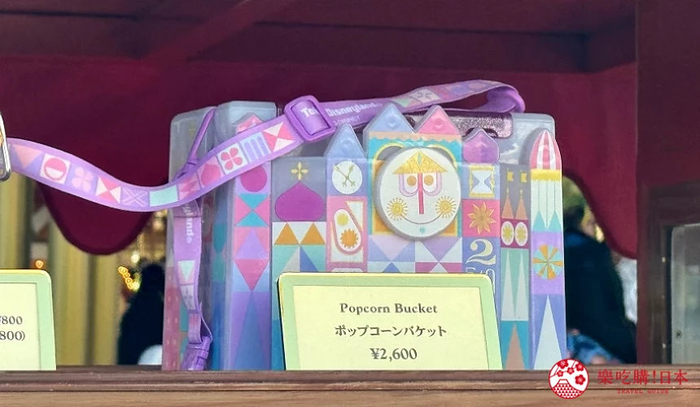 「小小世界爆米花桶」是个紫色的方盒,让旅人可以将小小世界的城堡提在手上带回家。如果打开下方绿色的门还可以看到可爱的小公仔,真的是很有巧思的设计!另外,「小小世界爆米花桶」的贩售处「⑥ 城堡旋转木马旁」是全园区唯一可以买到奶茶口味爆米花的地方,喜欢尝试新口味的旅人绝对不能错过!
