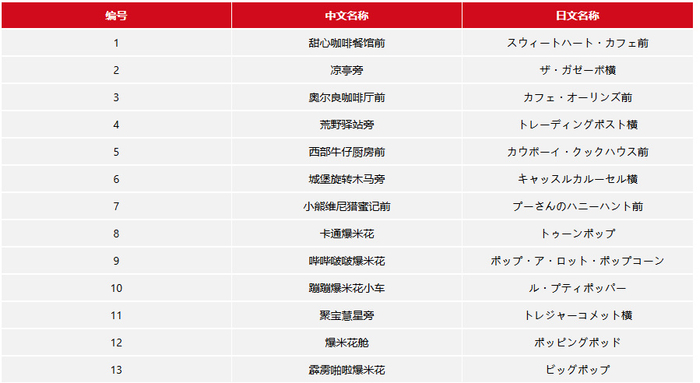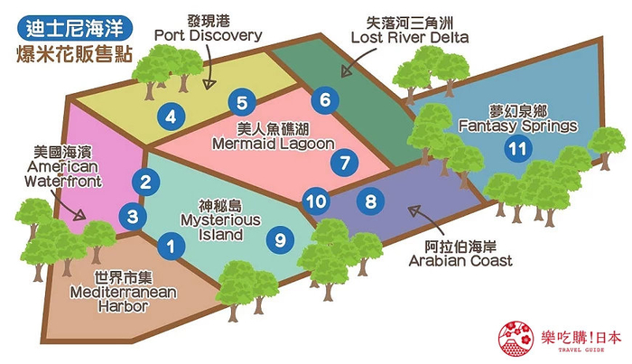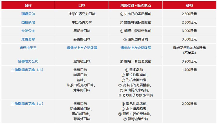 ⑪ 聚宝慧星旁:盐味⑦ 小熊维尼猎蜜记前:蜂蜜口味⑤ 西部牛仔厨房前:黑胡椒口味⑨ 哔哔啵啵爆米花:玉米浓汤口味③ 奥尔良咖啡厅前:抹茶白巧克力口味⑬ 霹雳啪啦爆米花:草莓千层酥、盐味焦糖、巧达起司口味(BB 爆米花)⑥ 城堡旋转木马旁:奶茶口味.【海洋】① 里多岛前:焦糖口味⑩ 海龟礼品店前:焦糖口味⑤ 水上逗趣船旁:奶油酱油口味④ 鳕鱼岬锦标美食前:牛奶巧克力口味⑧ 阿拉伯海岸前:咖哩口味⑥ 飞机库舞台旁:盐味⑨ 翱翔:梦幻奇航前:黑胡椒口味② 船坞边舞台前:蒜香虾口味⑦ 史卡托的寄居蟹前:抹茶白巧克力口味③ 自由码头小吃前:烤牛肉口味