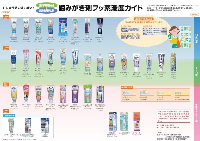预防蛀牙的日文写作「虫歯予防」或「むし歯予防」,通常会借由添加氟化物到牙膏中,强化牙齿和促进牙齿本身的再石灰化、修复珐琅质,得到防止蛀牙的效果。基本上,牙膏大部分都含有氟,不过日本人在选择牙膏时,会依照使用者的年龄选择合适氟浓度的牙膏。日前X上就有网友分享了「牙膏含氟量图表」,标示5岁以下、6到14岁、15岁以上等不同阶段适用的牙膏,并且以图示说明医师建议牙膏用量,非常实用,建议读者们存下来参考!