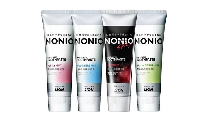 「Lion狮王 NONIO终结口气牙膏」有4种口味,分别是冰炫薄荷、澄橘薄荷、清梨薄荷、 酷乐薄荷等,除了对付口臭、维持口气清新,也主打能够去除牙齿黄斑、洁白牙齿。另外「Lion狮王Dent Health 药用牙膏」则是针对牙龈风险提高的50岁以上使用者,添加了狮王史上最大浓度药用成分 IPMP 和 TXA 来彻底根除口臭,被誉为配方最高级的牙膏!