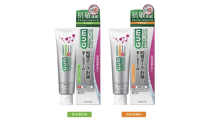 改善敏感性牙齿的牙膏有2种配方,一是添加防止刺激传输到神经的成分,二是添加能填补象牙质表面孔洞的成分。「G·U·M 专业抗敏牙周护理牙膏」有草本薄荷味和清新柑橘味,含乳酸铝和硝酸钾成分达到双重抗敏的效果,并添加西吡氯铵 (CPC) 成分,帮助消灭引发牙龈问题的细菌,改善牙龈健康。