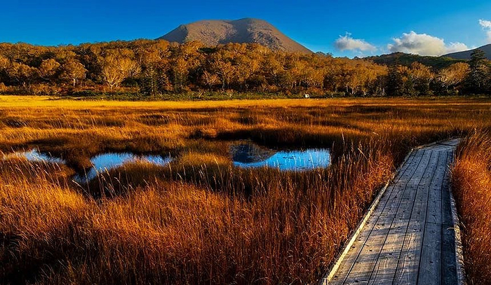 位于北海道西南部的神仙沼,是被群山包围的美丽湿原。秋季时,周围环绕着金黄的草地和五彩斑斓的枫叶,倒映在平静如镜的湖水中,如诗如画。清晨或黄昏时分,湖面上常常飘着薄雾,为这里增添了几分神秘感,宛如仙境一般。神仙沼区域总共有1,388公尺长的木栈道,时间充裕的话,推荐可以漫步其中,轻松步行一趟大约需时1至2小时。