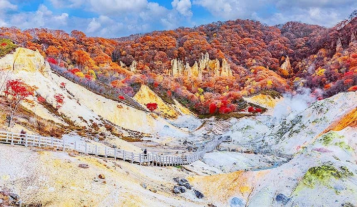 梦幻的白色烟雾笼罩、硫磺的特殊气息,登别温泉是北海道知名的温泉名所,秋季之时枫叶转红,温泉搭配红叶,让到访的旅人身心都能感受到温暖又迷人的优美景致。尤其南侧的大汤沼展望台能够望见大汤沼和红叶全景,是必到的景点喔!