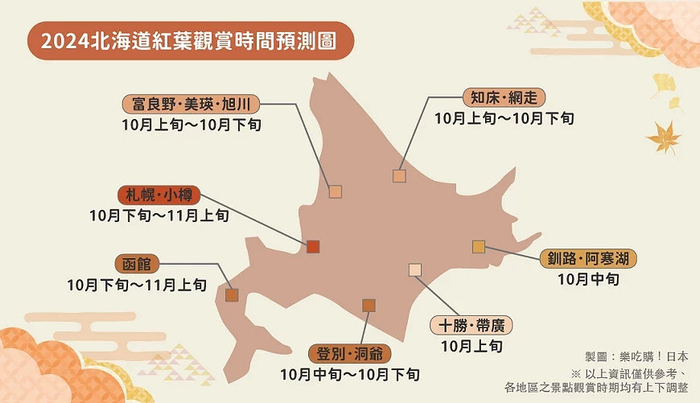 日本北海道红叶景点观赏时间地图