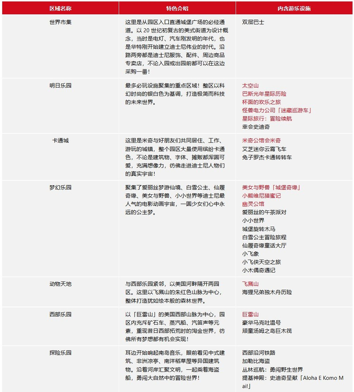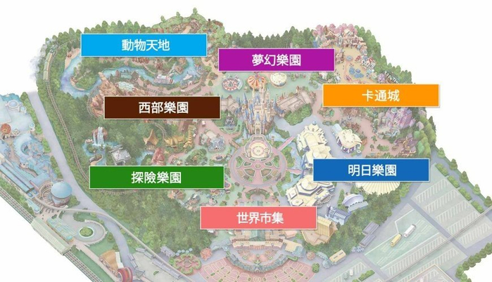 「东京迪士尼乐园」整体园区以仙履奇缘城堡为中心,7 大区环绕着城堡呈放射状分布。面向城堡顺时针依序:可选购到丰富迪士尼商品的世界市集、星际未来风格的明日乐园、经典迪士尼角色的卡通城、公主城堡特区的梦幻乐园、充满乡村绿意的动物天地、美式牛仔的西部乐园、异国神秘风的探险乐园。出发前先利用下面表格查好游乐设施的所在区域,接着照各区的相对位置前进,就可以轻松找到,不怕在园区迷路罗!
