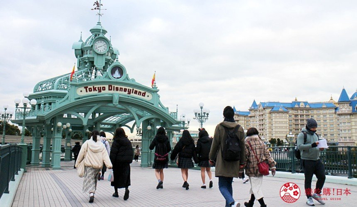 「东京迪士尼度假区」就位在 JR 舞滨站,出了改札口后往右手边直走,越过桥就会看到标有「Tokyo Disneyland」的招牌,步行 5 分钟就能抵达。步行途中会经过迪士尼纪念品专卖店,可以和姊妹淘们采买必备的帽子、饰品等装饰小物,整装之后一起进入梦之乐园!
