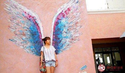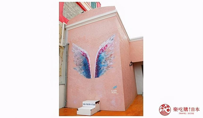 梦幻的「天使翅膀」彩绘就位在最像童话城堡的「Depot Island 区」二楼!设有两阶小阶梯,由下往上拍真的超显瘦!因为每一栋建筑物都互相连通,只要搭乘电梯到二楼,往户外露天阳台走就可以找到啰!