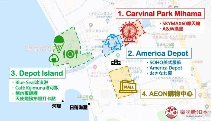 「美国村」虽然占地大,但每区都各自有显眼地标,找起路来其实一点也不复杂:第一区是有巨大摩天轮为地标的「Carvinal Park Mihama」、第二区有圆弧巨型建筑物的「America Depot」、第三区是占地最大连跨两区的「Depot Island」、第四区则是有巨大电影院的「AEON 购物中心」。