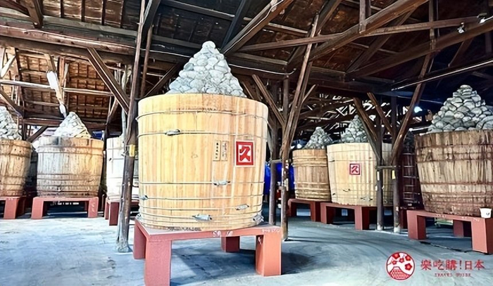 框久味噌今天仍采用古法制作味噌,职人以手工堆石头压在味噌桶上