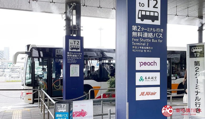 前文介绍过,第2航厦与第1航线位于不同区域,两航厦之间无通道连接,旅客须搭乘接驳车往返。如欲前往第2航厦搭机,从关西机场站出站后,只要依指示走到「AEROPLAZA」的一楼就会看到接驳车乘车处,约3~6分钟就有一班车,7分钟即可到第2航厦罗。