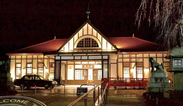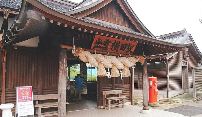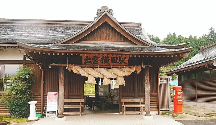 「众神之乡」岛根县内有一个名为奥出云町的小镇,这里有座建造于昭和年间的「出云横田车站」,是特别仿造神社外观来设计的车站,玄关上方还挂着模拟出云大社的大型注连绳,以豪迈字体书写的车站看板、站前的怀旧红色邮筒都十分具有昭和风情。