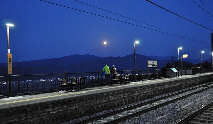 于明治年间启用的「姨舍车站」位于长野县千曲市,地处海拔547公尺制高点,能眺望风光明媚的善光寺平盆地,特别是从月台及列车上所看到的景色更是迷人,入夜时还能看见地平线上幽微的灯光点亮、月色由远处的镜台山升起,在早期日本国铁时代就被选为「日本三大车窗」之ㄧ,同时也被誉为「赏月车站(月の駅)」。此外由诶姨舍车站建造于斜坡上,月台进站轨道采十分罕见的「之字形」路线,也是看点之一。