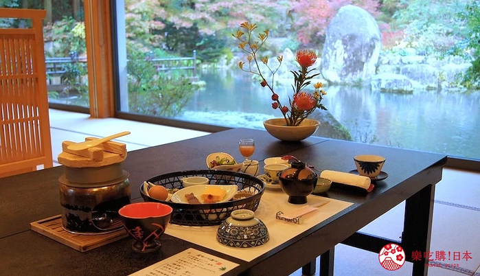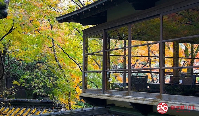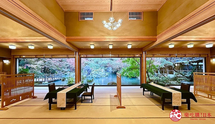 传统料亭除了有高级的餐饮,还会搭配日式庭园造景,让客人一边用餐一边看风景。 「料亭旅馆清流庵」的用餐空间则是约120平方公尺的「大广间」,以宽15公尺的透明落地玻璃隔出室内室外空间,非常地壮观。