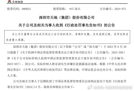 8月4日晚间,*ST深天(深天地A,股票代码000023)公告称,公司及相关当事人近期收到了深圳证监局下发的[2024]14号《行政处罚事先告知书》。经查明,公司未按规定披露担保事项和未按规定披露非经营性资金往来的关联交易。
