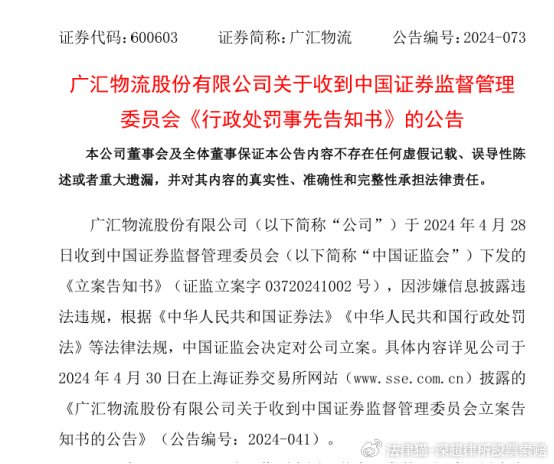 2024年4月30日,广汇物流股份有限公司(简称:广汇物流,代码:600603)发布《关于收到中国证券监督管理委员会立案告知书的公告》,称因公司涉嫌信息披露违法违规等行为,根据《中华人民共和国证券法》的有关规定,中国证券监督管理委员会决定对公司立案调查。同日,广汇物流发布《关于公司及相关人员收到中国证券监督管理委员会四川监管局行政监管措施决定书的公告》。