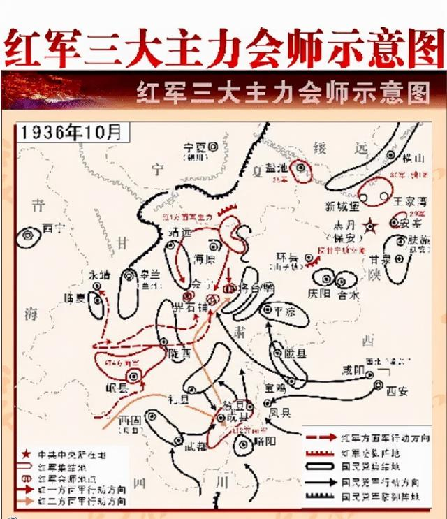 △红军三大主力会师示意图10月的西北,秋高气爽,古老的会宁城红旗飘扬。红一、红四方面军两军战友含着激动的泪水,抛下肩上的背包,紧紧拥抱在一起。会宁,这个偏居中国西北的小城一下子成了红军之城,满城的红军无不兴高采烈,无论此前是否相识都如同久别重逢的亲人一般。