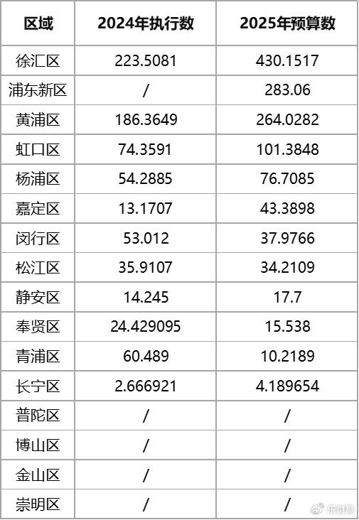 黄浦区2025年预算为264.0282亿,是2024年执行数的142.67%,虹口区2025年预算为101.3848亿,是2024年执行数的136.34%。