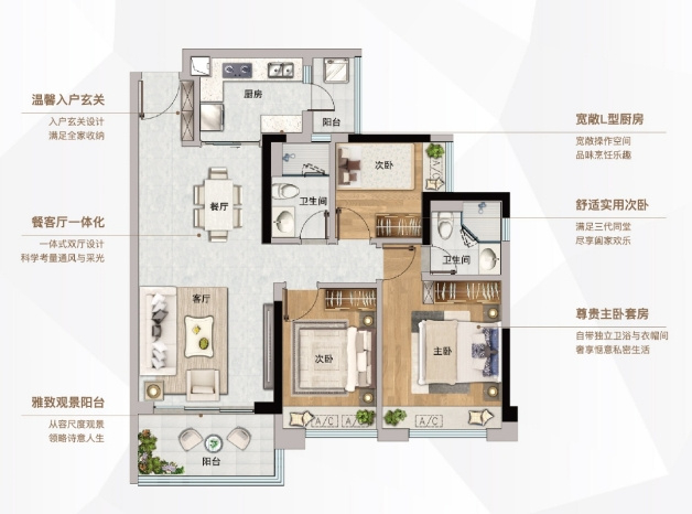这个建面约82㎡三房两厅户型,厨房和生活阳台围起来是六边形的,像极了广州以前90年代的房子设计。