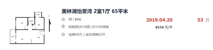 5年后,这些房源陆续进入到二手市场,贝壳网显示,2019年怡景湾组团一套建面约65㎡两房户型,以总价53万元成交,单价8154元/㎡。