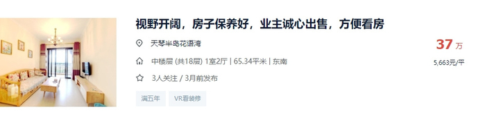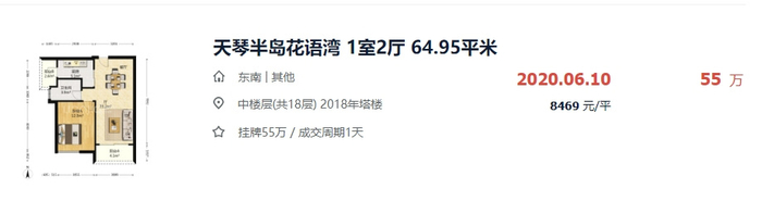 新一点的天琴半岛组团情况也不咋地,建面约65㎡户型,2020年还能卖55万元,现在挂牌价也跌到37万元了。