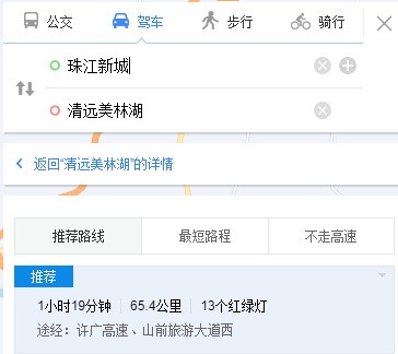 一是从地理位置上看,美林湖位于清远清城区,接壤广州花都区,从广州市区自驾过去,百度地图显示约1小时19分,跟老广们平时开车去从化泡温泉时间差不多了。