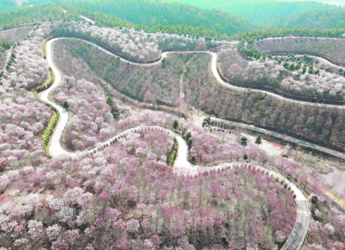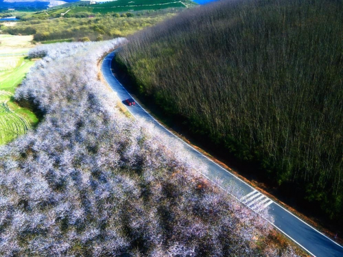 这是通向大佛山养心谷景区的樱花大道,红色的jeep车,弯道樱花和车子实在是绝配,为郎溪这座小城添了不少浪漫气息,航拍下的樱花大道真是美的惊艳!