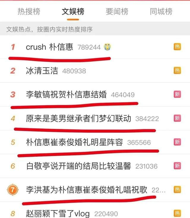“李敏镐祝贺朴信惠结婚”、“原来是美男继承者们梦幻联动”、“朴信惠崔泰俊婚礼明星阵容”、“李洪基为朴信惠崔泰俊婚礼唱祝歌”等多个话题词,还一举爬上了中国内地的娱乐热搜榜。