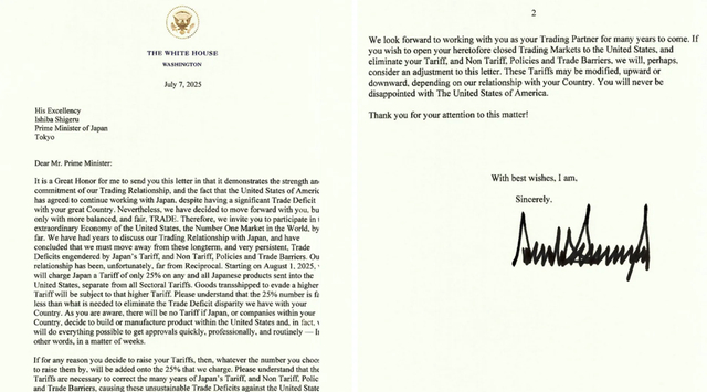 2025年7月,美国总统特朗普向日本首相石破茂公开一封信,宣布自8月1日起,对日本进口汽车加征25%的关税。这不仅在日本政界和产业界引起震动,也表明美日经贸谈判陷入了空前的僵局。