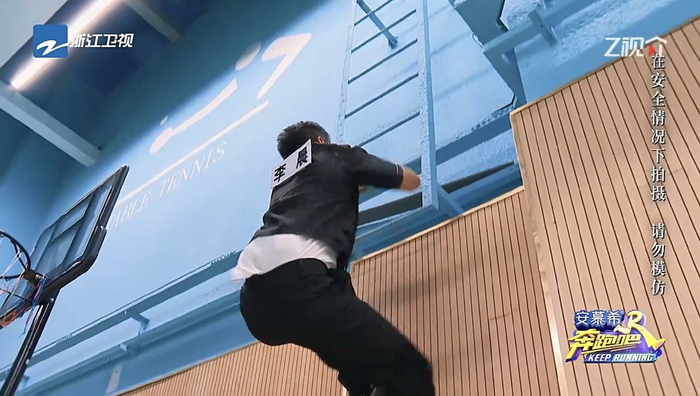 李晨帮助段晓薇躲到柜子上面后,自己则“飞檐走壁”爬到了体育馆的上方。不愧是“大黑牛”,捉迷藏的方式也如此与众不同。同为体育社的沈泉锐也发现了一处栖身之处——冰箱的后面。