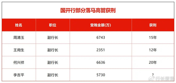 近年来,国开行总行4名副行长相继被查——何兴祥、周清玉、王用生、李吉平,其中何兴祥为任上落马,周清玉系未到龄被免职,王用生和李吉平则双双于退休后落马;就在2025年2月14日情人节当天,李吉平受贿案一审开庭。