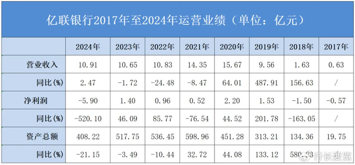 营收、净利的表现亦不尽如人意。2021年到2024年,亿联银行营业收入分别为14.35亿元、10.83亿元、10.65亿元、10.91亿元,分别下滑8.47%、下滑24.48%、下滑1.72%、微增2.47%;2021年到2024年,净利润分别为0.52亿元、0.96亿元、1.4亿元、-5.9亿元。