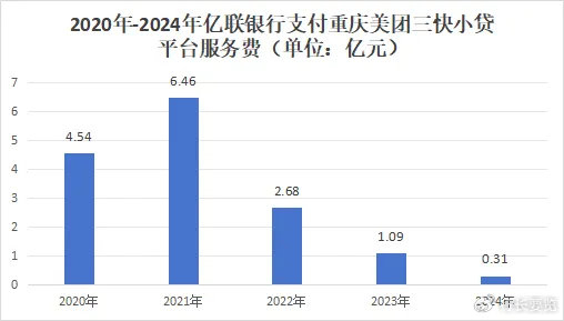亿联银行2021年财报显示,当年该行与重庆美团三快小额贷款公司间发生18笔重大关联交易事项,为本行向关联方支付平台服务费(含催收服务费),金额合计6.46亿元。不过到了2022年、2023年、2024年末,相关关联交易(平台服务费)分别下降至2.68亿元、1.09亿元、3056.04万元。