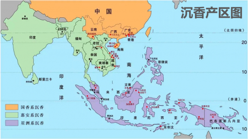 所谓“国香系”包括中国海南、香港、广东等地;“惠安系”就是上图绿色部分的沉香产区,有越南、柬埔寨等产区;“星洲系”就是上图紫色部分,包括菲律宾、印尼、文莱等产区。