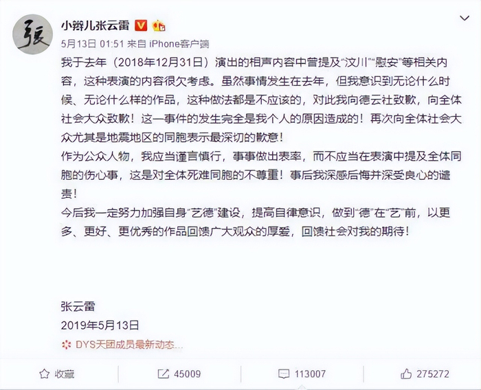 对此,张云雷及时道歉,但他依然没有改正。