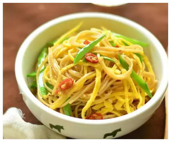 3.锅里抹一层薄薄的油,将鸡蛋打散摊成蛋饼,随后切成细丝。荷兰豆放滚水中焯熟后切成细丝 。