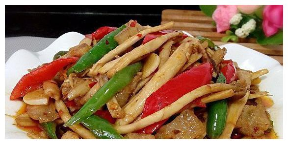 材料:茶树菇500g 猪五花肉约80g 青椒红椒各一个 姜2片 大蒜(独蒜)半个 豆瓣酱一勺 老抽2/3小勺 糖
