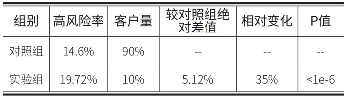 Z为随机变量,查标准正态分布表确定P值。表4展示了对各组目标指标的检验结果。实验组的客户高风险率高于对照组,且P值小于0.05,可以证明新模型对潜在高风险客户更敏感,识别能力更强。