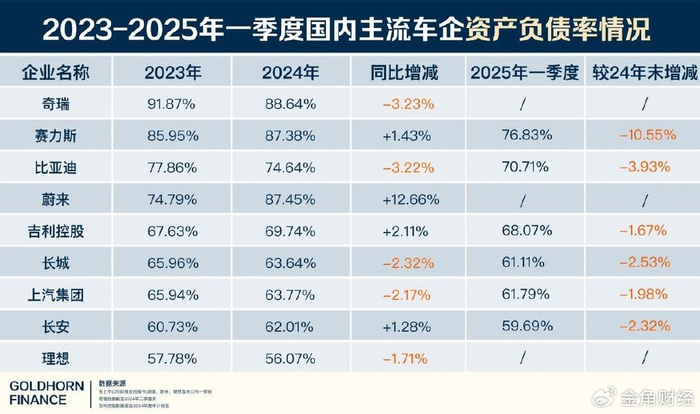 国内车企也不例外,奇瑞负债率高达88.64%(截至2024年三季度末),蔚来和赛力斯的负债率分别为87.45%和87.38%,其他国内主流车企的负债率同样和大部分海外车企保持统同一水平。
