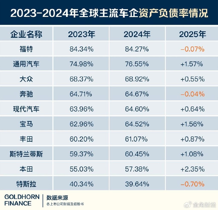 2024年,福特的负债率达到84.27%,通用汽车为76.55%,大众集团是68.92%,大部分头部车企的负债率都在60%以上。