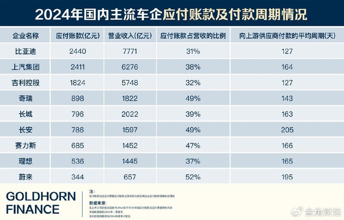 此外,企业和供应商要实现互利共赢,除了采购规模,付款速度和及时性也很关键。其中,应付账款周转天数是重要参考依据。Wind数据显示,截至2024年末,比亚迪平均127天完成对上游供应商的付款,长城汽车为163天,蔚来195天,长安超过200天。比亚迪的付款周期是行业最短的,足以体现中国头部车企对于产业链健康发展的积极带动作用。