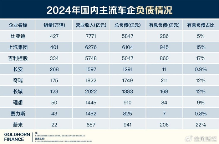 2024年,比亚迪汽车销量达427万辆,与通用、福特处于同一量级。但福特和通用的总负债与同期营收的比例均超过100%,比亚迪仅为75%;两家外资巨头的有息负债占总负债比例都超过60%,比亚迪的这一比例只有5%,偿债压力远低于国际竞争对手。