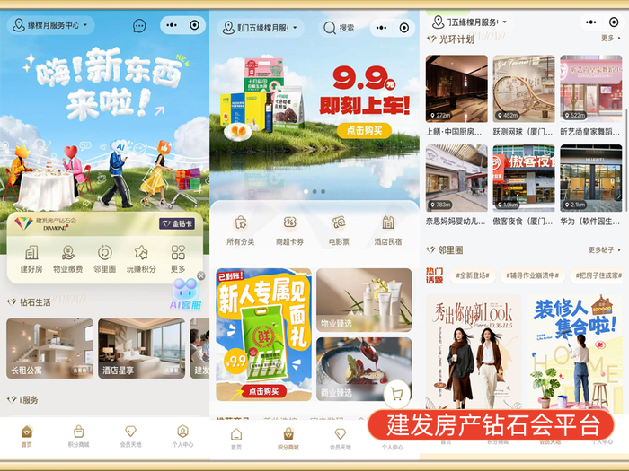 作为建发房产官方线上一站式智能客户服务平台,“建发房产钻石会”自2020年上线以来,始终围绕业主生活场景提供便捷、智能的美好生活体验,已基本实现全业态互联、全场景服务自助化,更以会员制提供多元权益。截至目前,平台服务会员超300万,覆盖业主超30万,周浏览量超百万次。今年10月30日,平台进一步升级,从四大维度构建更智慧、丰盈、便捷的价值体系:一是升级智慧AI服务,实现7×24小时在线响应;二是完善会员权益与社群体系,搭建高端生活圈层,提供定制化体验活动;三是优化功能布局,让访客预约、装修申请、报修等精细化服务一键直达;四是升级独立积分商城,拓展多元消费场景,强化用户粘性。
