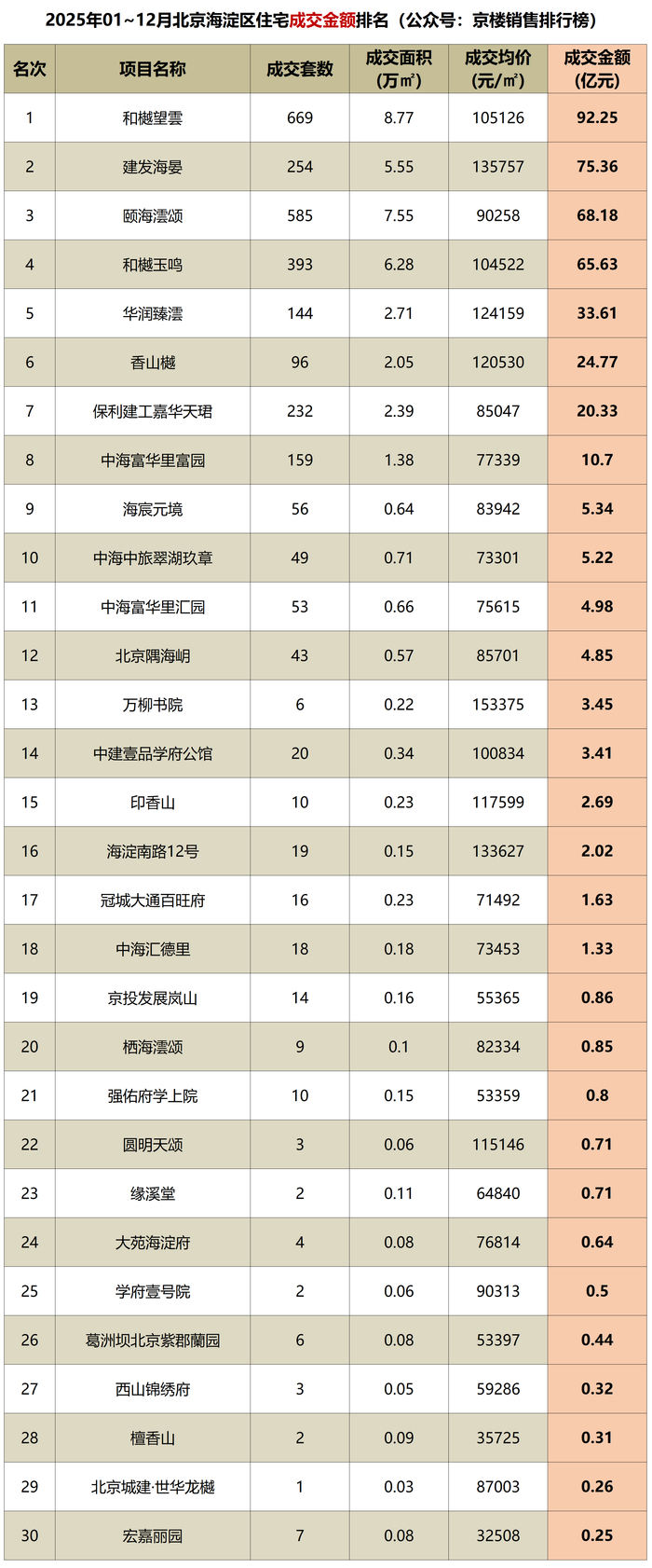 乐居财经 吴文婷 1月1日,据京楼销售排行榜,2025年1月1日-2025年12月31日,北京市海淀区住宅成交2885套,成交面积41.66万㎡,成交均价103793元/㎡,成交金额432.4亿元。