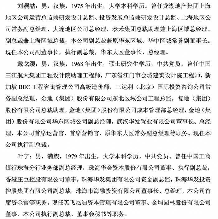 刘颖喆,男,汉族,1975年出生,大学本科学历。其曾任龙湖地产集团上海地区公司运营总监兼研发设计总监、投资发展总监兼研发设计总监、上海地区公司常务副总经理、大连地区公司总经理,泰禾集团总裁助理兼上海区域总经理、副总裁兼上海区域总裁,公司副总裁兼原华东区域、华中区域常务副董事长。现任公司副董事长,执行副总裁,华东大区董事长、总经理。