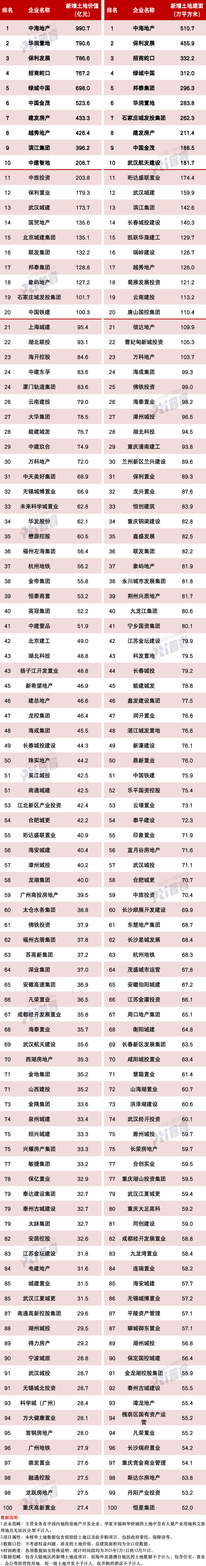 此外,招商蛇口以新增土地价值767.2亿元居第四,绿城中国以新增土地价值698亿元排在第五。