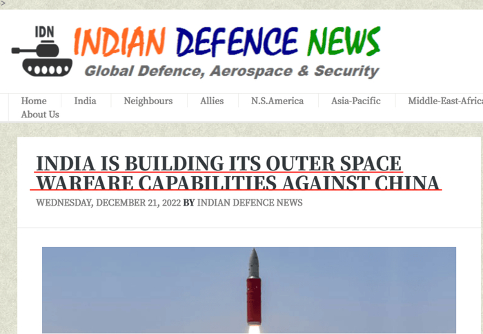 近日,综合印度媒体《南亚之声》、《印度国防新闻》等文章称,印度政府对日益扩大的中印太空作战能力差距感到担忧,为此,其正在加强印度的外太空作战能力,希望有朝一日能够发展出与中国相匹敌的太空作战能力。印度媒体称,随着中国反卫星技术实力的发展,中国有能力打掉印度所有的军用监视卫星,印度目前缺乏任何有效的防御手段,同时也不具备充分的“反制”能力,为此,印度应该更积极地投入更多经费发展太空作战能力,从而“抵消”中国在太空领域的战略威慑能力。