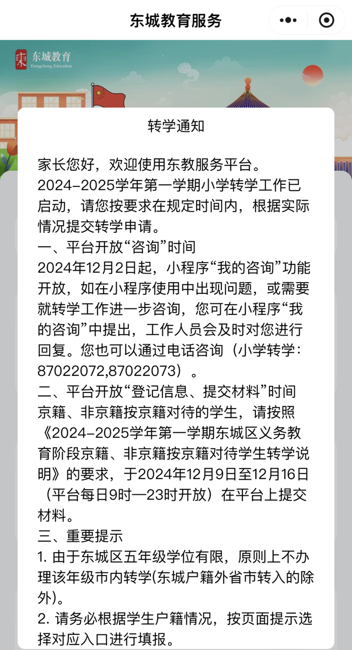 近日,东城区发布小学转学通知。通知中提到按照《2024-2025学年第一学期东城区义务教育阶段京籍、非京籍按京籍对待学生转学说明》的要求,于2024年12月9日至12月16日(平台每日9时-23时开放)在平台上提交材料。